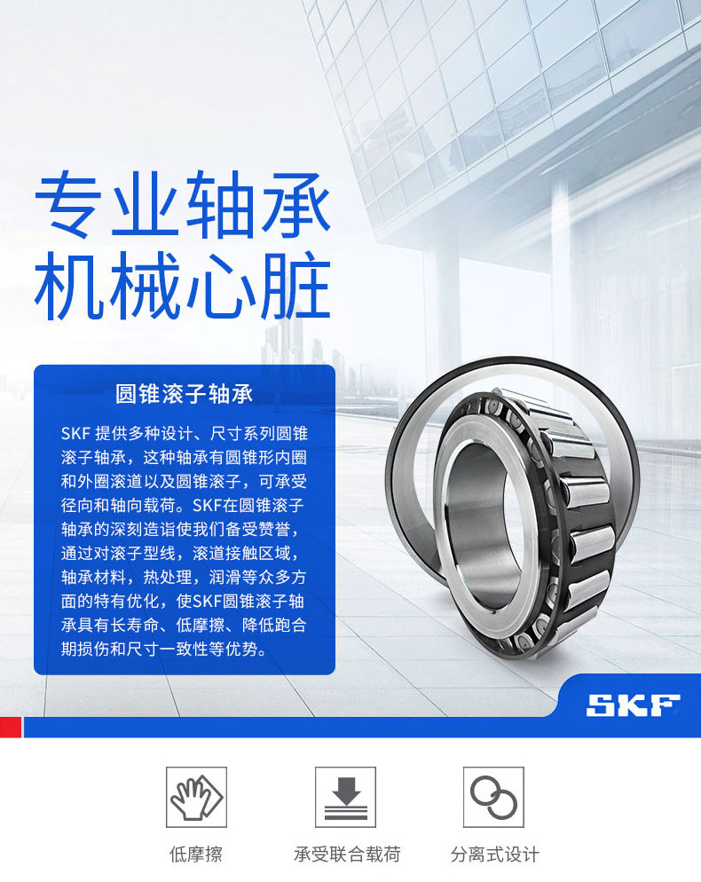 SKF圓錐滾子軸承,可以分離,由內圈與滾子、保持架一起組成的組件和外圈可以分別安裝。 產品特性: 滾子和滾道接觸處修正的接觸線可以減少應力集中。SKF圓錐滾子軸承可以承受大的徑向載荷和軸向載荷。